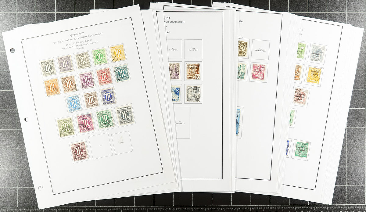 "Back of the Book" (no Semi-Postals). Collection of 767 different stamps, all mounted on nicely designed computer-generated pages. The material consists of airmails (39 stamps, $110.00 cat), officials (89 stamps, $118.65 cat), franchise stamps (11 stamps, $15.65 cat), newspaper stamps (2 stamps, $5.85 cat), Allied M.G. (31 stamps, $99.25 cat), French occupation (90 stamps, $168.85 cat), Soviet occupation (45 stamps, $35.50 cat), Berlin (354 stamps $595.20 cat), Russian occupation (83 stamps, $79.15 cat) and Offices in China (23 stamps, $43.45 cat). A good start to these more obscure issues. Only sound stamps valued. Owner's 2017 Scott US$1,271.55 =