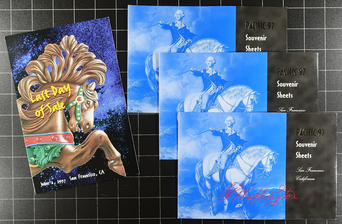 1997 International Stamp Show Memorabilia. Carton full of philatelic souvenirs and Post Office products from the two big 1997 International Stamp Exhibitions, consisting of items from Hong Kong '97 and Pacific '97 (San Francisco). This lot offers a wealth of material, from show programs, mint and used stamps, souvenir sheets, commemorative cancels, postal stationery, promotional items and sundry, both from the host country and numerous foreign postal authorities as well as clubs and official organizations. A marvelous lot for the modern exhibition historian / researcher / collector. Estimate =