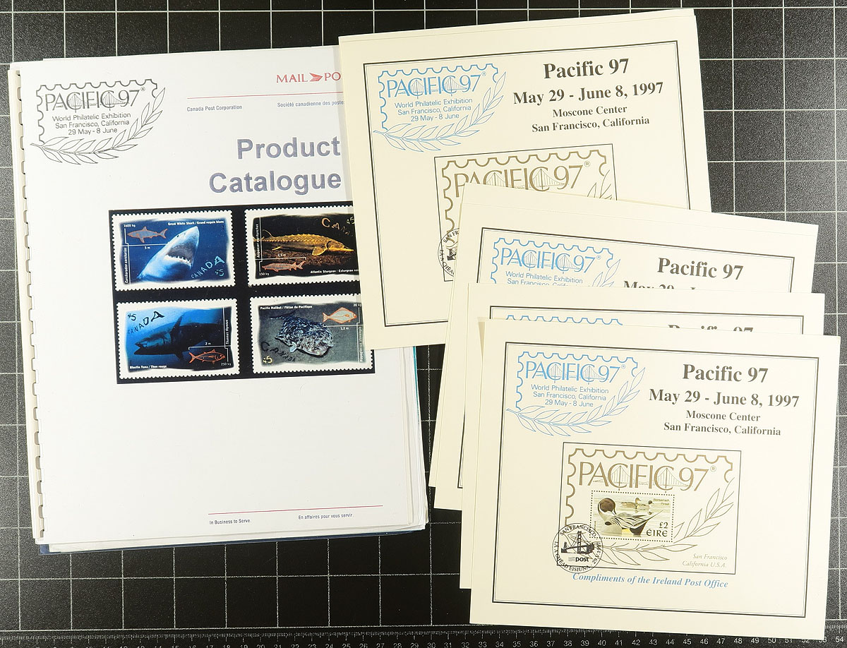 1997 International Stamp Show Memorabilia. Carton full of philatelic souvenirs and Post Office products from the two big 1997 International Stamp Exhibitions, consisting of items from Hong Kong '97 and Pacific '97 (San Francisco). This lot offers a wealth of material, from show programs, mint and used stamps, souvenir sheets, commemorative cancels, postal stationery, promotional items and sundry, both from the host country and numerous foreign postal authorities as well as clubs and official organizations. A marvelous lot for the modern exhibition historian / researcher / collector. Estimate =