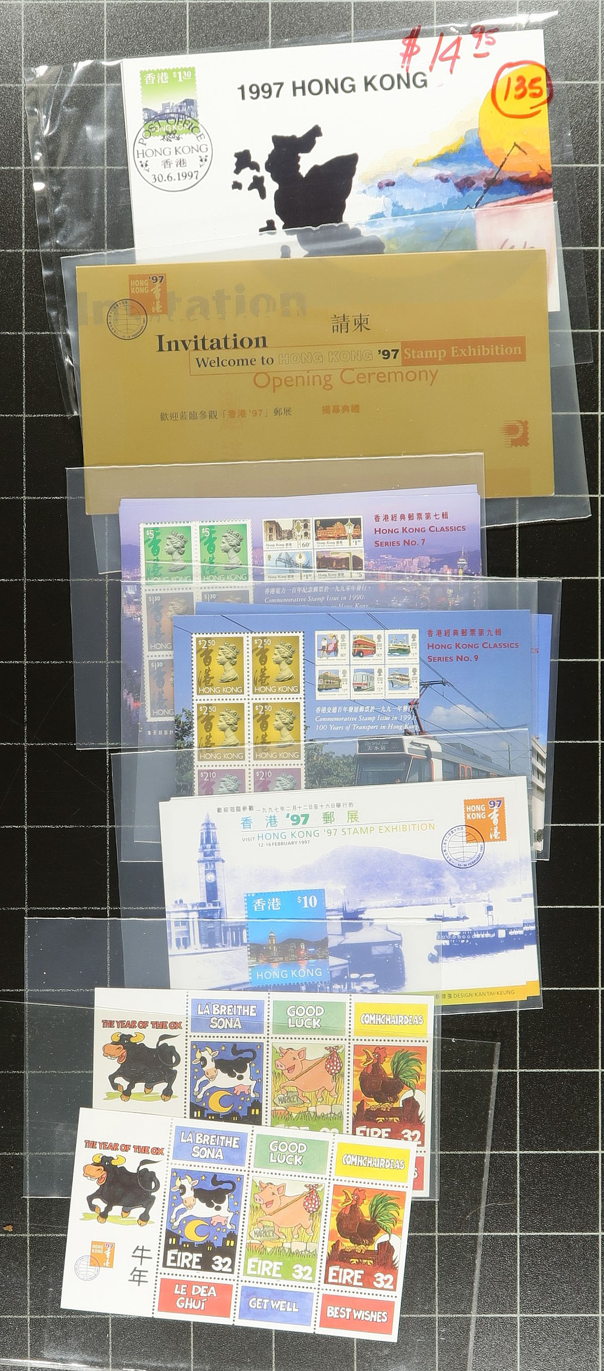 1997 International Stamp Show Memorabilia. Carton full of philatelic souvenirs and Post Office products from the two big 1997 International Stamp Exhibitions, consisting of items from Hong Kong '97 and Pacific '97 (San Francisco). This lot offers a wealth of material, from show programs, mint and used stamps, souvenir sheets, commemorative cancels, postal stationery, promotional items and sundry, both from the host country and numerous foreign postal authorities as well as clubs and official organizations. A marvelous lot for the modern exhibition historian / researcher / collector. Estimate =