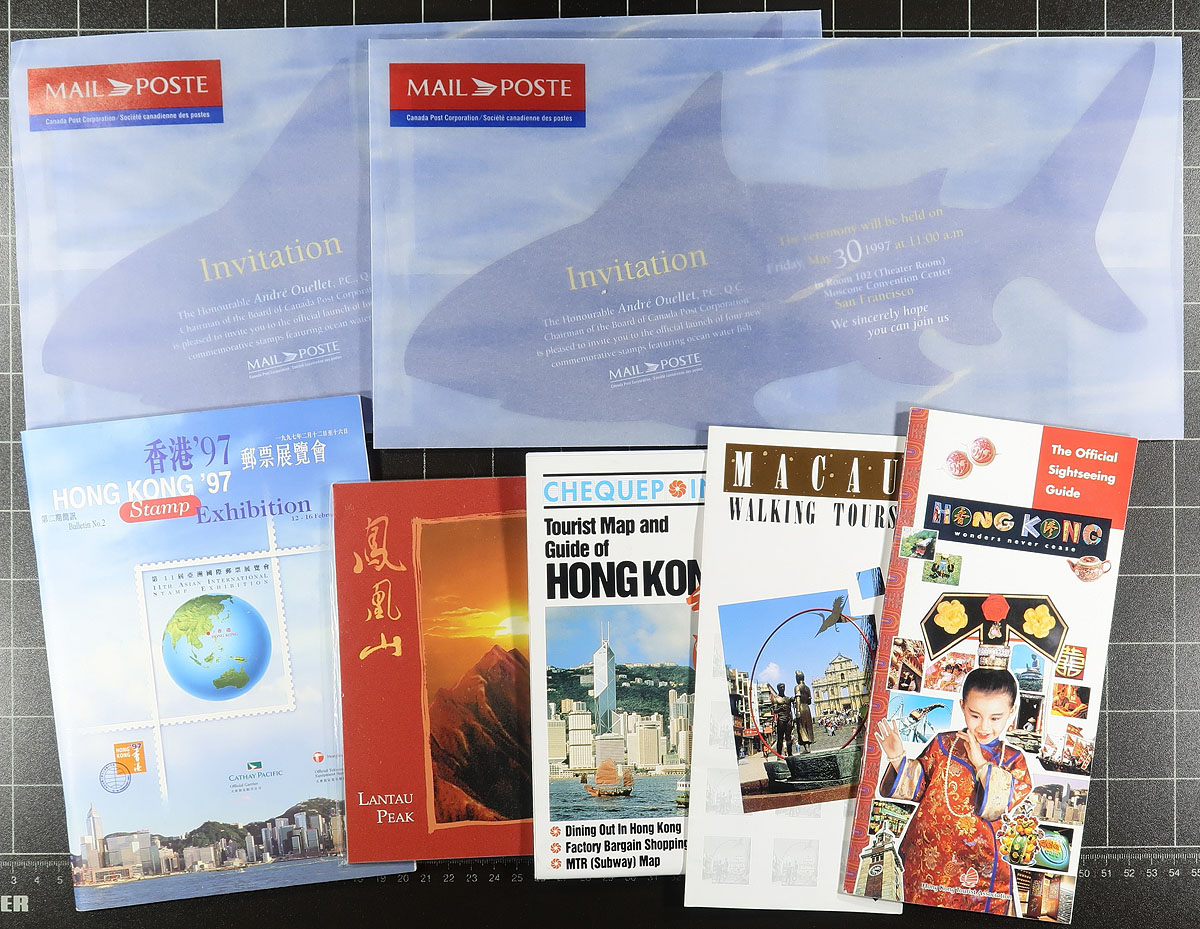1997 International Stamp Show Memorabilia. Carton full of philatelic souvenirs and Post Office products from the two big 1997 International Stamp Exhibitions, consisting of items from Hong Kong '97 and Pacific '97 (San Francisco). This lot offers a wealth of material, from show programs, mint and used stamps, souvenir sheets, commemorative cancels, postal stationery, promotional items and sundry, both from the host country and numerous foreign postal authorities as well as clubs and official organizations. A marvelous lot for the modern exhibition historian / researcher / collector. Estimate =