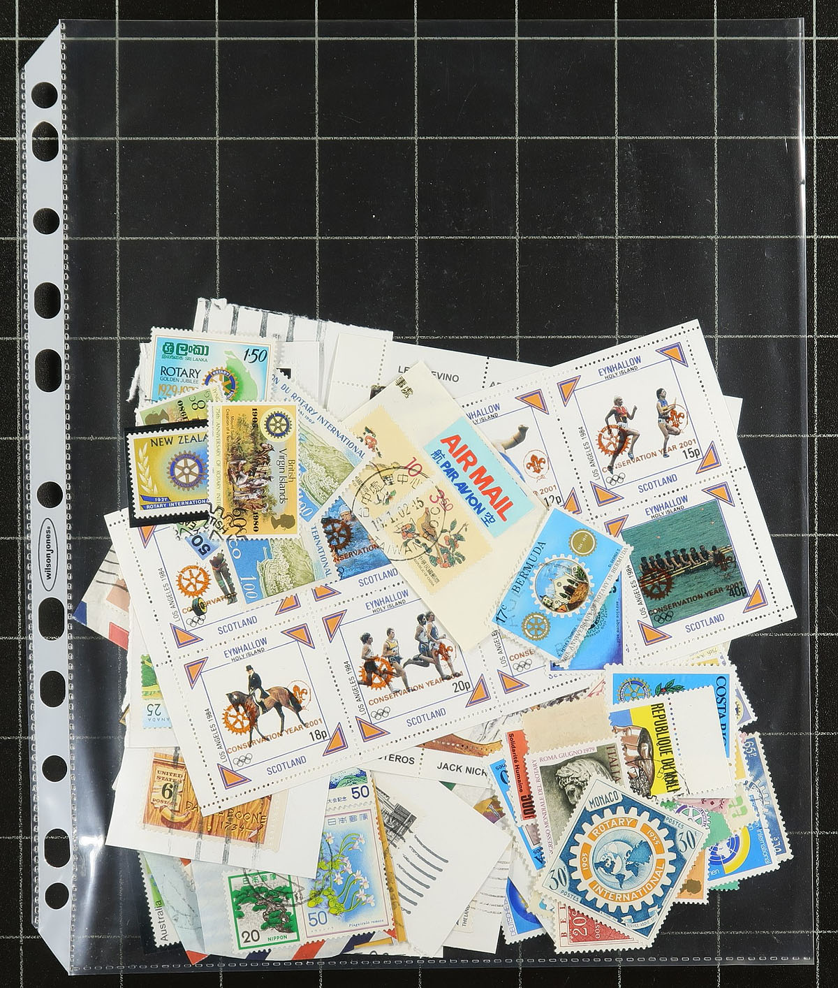 Rotary International Thematic Collection. Fat 3-ring binder stuffed with Rotary International-themed material. The lot includes a good number of obscure and interesting pieces, from the basic stamps and souvenir sheets to commemorative covers, signed items and numerous convention souvenirs. Saw some pieces dating back to the 1930s. Could contain some scarce items. Estimate =