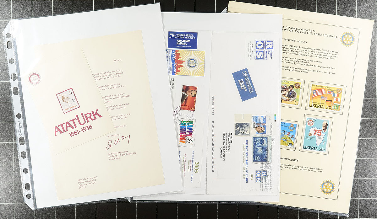 Rotary International Thematic Collection. Fat 3-ring binder stuffed with Rotary International-themed material. The lot includes a good number of obscure and interesting pieces, from the basic stamps and souvenir sheets to commemorative covers, signed items and numerous convention souvenirs. Saw some pieces dating back to the 1930s. Could contain some scarce items. Estimate =