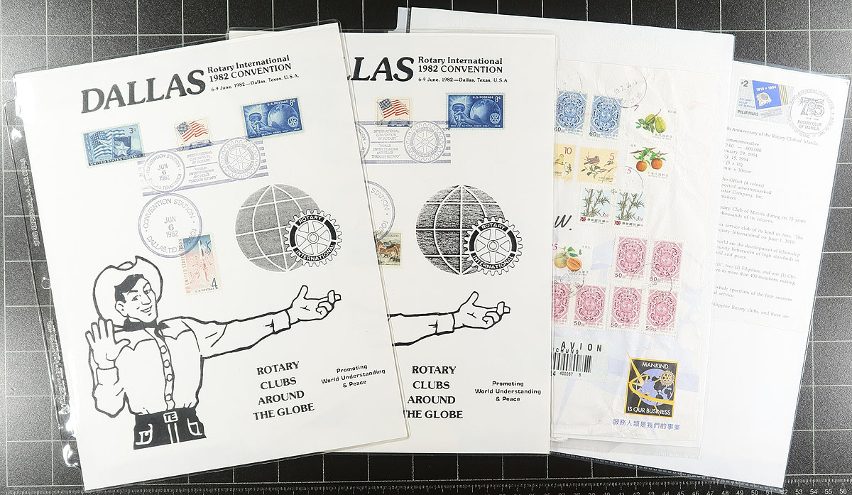 Rotary International Thematic Collection. Fat 3-ring binder stuffed with Rotary International-themed material. The lot includes a good number of obscure and interesting pieces, from the basic stamps and souvenir sheets to commemorative covers, signed items and numerous convention souvenirs. Saw some pieces dating back to the 1930s. Could contain some scarce items. Estimate =