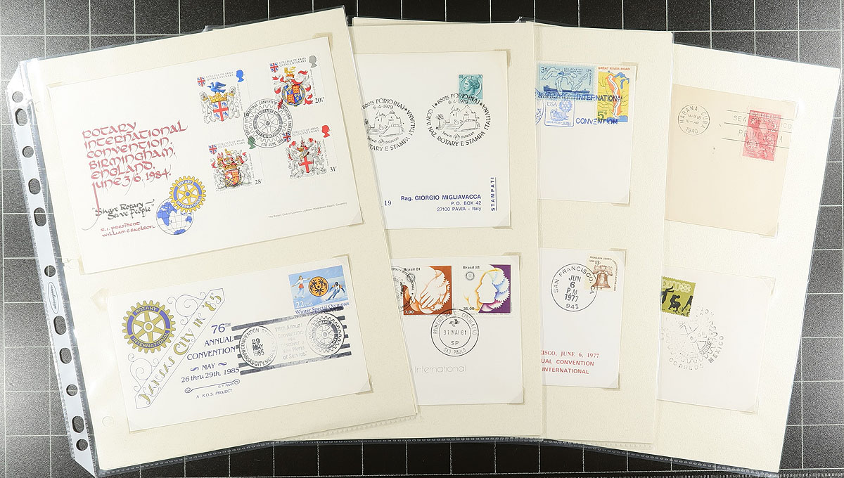Rotary International Thematic Collection. Fat 3-ring binder stuffed with Rotary International-themed material. The lot includes a good number of obscure and interesting pieces, from the basic stamps and souvenir sheets to commemorative covers, signed items and numerous convention souvenirs. Saw some pieces dating back to the 1930s. Could contain some scarce items. Estimate =