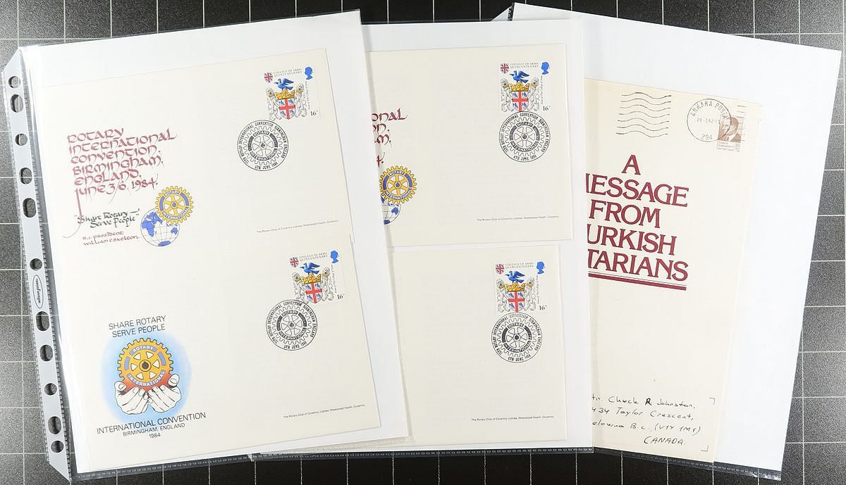 Rotary International Thematic Collection. Fat 3-ring binder stuffed with Rotary International-themed material. The lot includes a good number of obscure and interesting pieces, from the basic stamps and souvenir sheets to commemorative covers, signed items and numerous convention souvenirs. Saw some pieces dating back to the 1930s. Could contain some scarce items. Estimate =