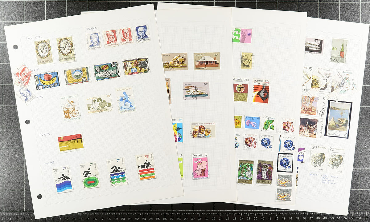 Used and mint NH 1963 to 1984 period collection of 983 stamps, 3 booklets and 10 souvenir sheets, plus 5 FDCs/cards. All Hinged (the used) or laid out in mounts (the mint NH) on 3-ring quadrille album pages. The total face value as useable postage is AUD$127.88=$116.50 CDN. Owner's older 2014 Scott US$709.85 =