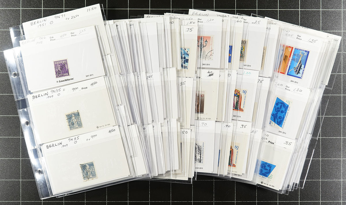 Dealer's stock in identified and valued "102" cards housed in three small 3-ring binders, consisting of Germany #4//2163 (129 stamps, Scott US$968.05), Berlin #9N2//9NB285 (501 stamps, Scott US$1333.75) and Austria #19//2040 plus "back of the book" (124 stamps, Scott US$394.05). A very useful "show-ready" selection of 1872 to 2006 issues with some duplication. The previous owner's retail prices are also indicated though the catalogue values are somewhat out of date. Owner's Scott US$2695.85 ($3639.40 CDN). Estimate =