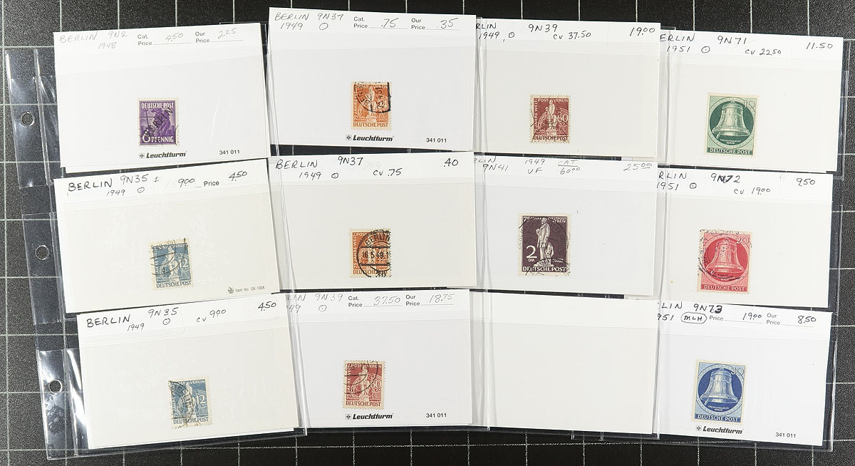 Dealer's stock in identified and valued "102" cards housed in three small 3-ring binders, consisting of Germany #4//2163 (129 stamps, Scott US$968.05), Berlin #9N2//9NB285 (501 stamps, Scott US$1333.75) and Austria #19//2040 plus "back of the book" (124 stamps, Scott US$394.05). A very useful "show-ready" selection of 1872 to 2006 issues with some duplication. The previous owner's retail prices are also indicated though the catalogue values are somewhat out of date. Owner's Scott US$2695.85 ($3639.40 CDN). Estimate =