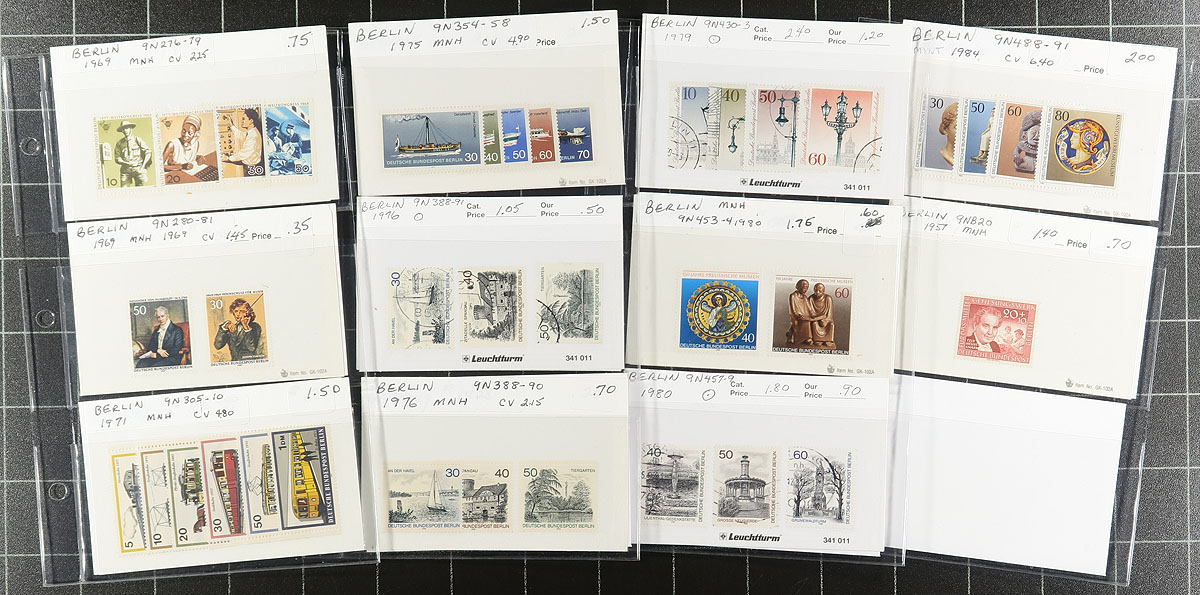 Dealer's stock in identified and valued "102" cards housed in three small 3-ring binders, consisting of Germany #4//2163 (129 stamps, Scott US$968.05), Berlin #9N2//9NB285 (501 stamps, Scott US$1333.75) and Austria #19//2040 plus "back of the book" (124 stamps, Scott US$394.05). A very useful "show-ready" selection of 1872 to 2006 issues with some duplication. The previous owner's retail prices are also indicated though the catalogue values are somewhat out of date. Owner's Scott US$2695.85 ($3639.40 CDN). Estimate =