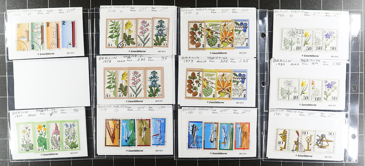 Dealer's stock in identified and valued "102" cards housed in three small 3-ring binders, consisting of Germany #4//2163 (129 stamps, Scott US$968.05), Berlin #9N2//9NB285 (501 stamps, Scott US$1333.75) and Austria #19//2040 plus "back of the book" (124 stamps, Scott US$394.05). A very useful "show-ready" selection of 1872 to 2006 issues with some duplication. The previous owner's retail prices are also indicated though the catalogue values are somewhat out of date. Owner's Scott US$2695.85 ($3639.40 CDN). Estimate =