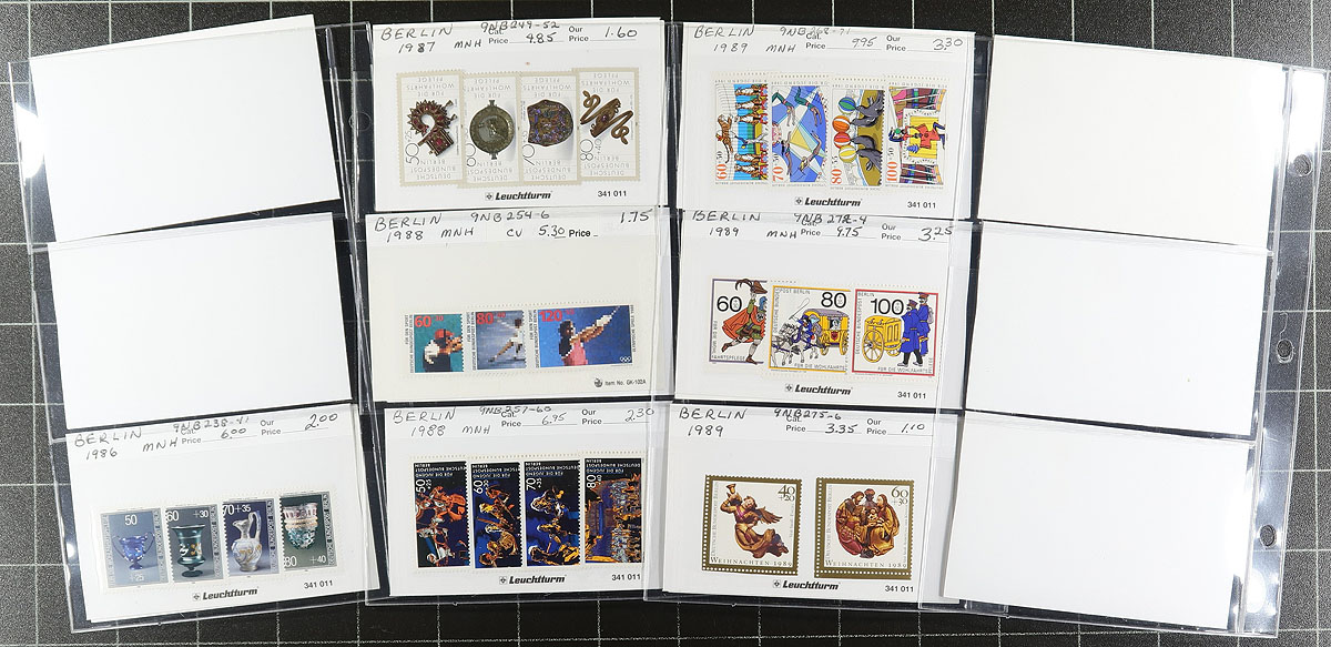 Dealer's stock in identified and valued "102" cards housed in three small 3-ring binders, consisting of Germany #4//2163 (129 stamps, Scott US$968.05), Berlin #9N2//9NB285 (501 stamps, Scott US$1333.75) and Austria #19//2040 plus "back of the book" (124 stamps, Scott US$394.05). A very useful "show-ready" selection of 1872 to 2006 issues with some duplication. The previous owner's retail prices are also indicated though the catalogue values are somewhat out of date. Owner's Scott US$2695.85 ($3639.40 CDN). Estimate =