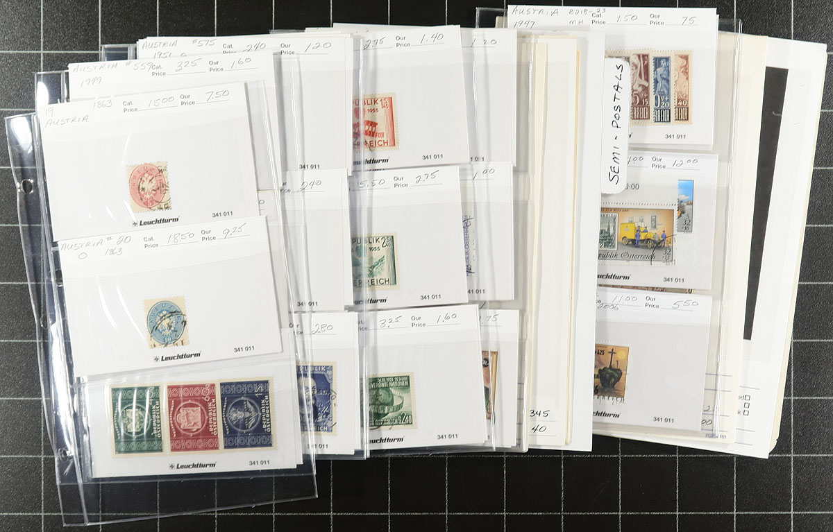 Dealer's stock in identified and valued "102" cards housed in three small 3-ring binders, consisting of Germany #4//2163 (129 stamps, Scott US$968.05), Berlin #9N2//9NB285 (501 stamps, Scott US$1333.75) and Austria #19//2040 plus "back of the book" (124 stamps, Scott US$394.05). A very useful "show-ready" selection of 1872 to 2006 issues with some duplication. The previous owner's retail prices are also indicated though the catalogue values are somewhat out of date. Owner's Scott US$2695.85 ($3639.40 CDN). Estimate =