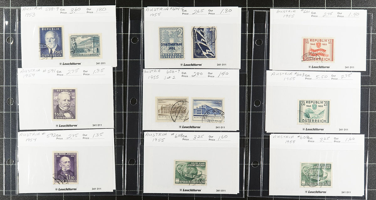 Dealer's stock in identified and valued "102" cards housed in three small 3-ring binders, consisting of Germany #4//2163 (129 stamps, Scott US$968.05), Berlin #9N2//9NB285 (501 stamps, Scott US$1333.75) and Austria #19//2040 plus "back of the book" (124 stamps, Scott US$394.05). A very useful "show-ready" selection of 1872 to 2006 issues with some duplication. The previous owner's retail prices are also indicated though the catalogue values are somewhat out of date. Owner's Scott US$2695.85 ($3639.40 CDN). Estimate =