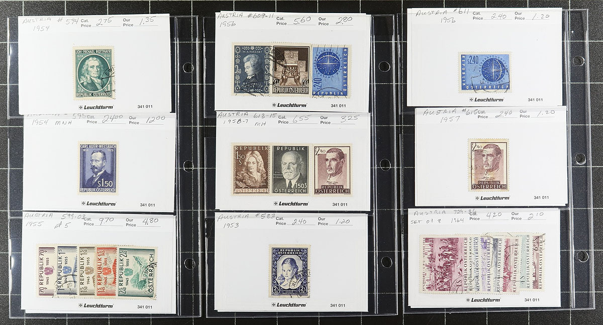 Dealer's stock in identified and valued "102" cards housed in three small 3-ring binders, consisting of Germany #4//2163 (129 stamps, Scott US$968.05), Berlin #9N2//9NB285 (501 stamps, Scott US$1333.75) and Austria #19//2040 plus "back of the book" (124 stamps, Scott US$394.05). A very useful "show-ready" selection of 1872 to 2006 issues with some duplication. The previous owner's retail prices are also indicated though the catalogue values are somewhat out of date. Owner's Scott US$2695.85 ($3639.40 CDN). Estimate =