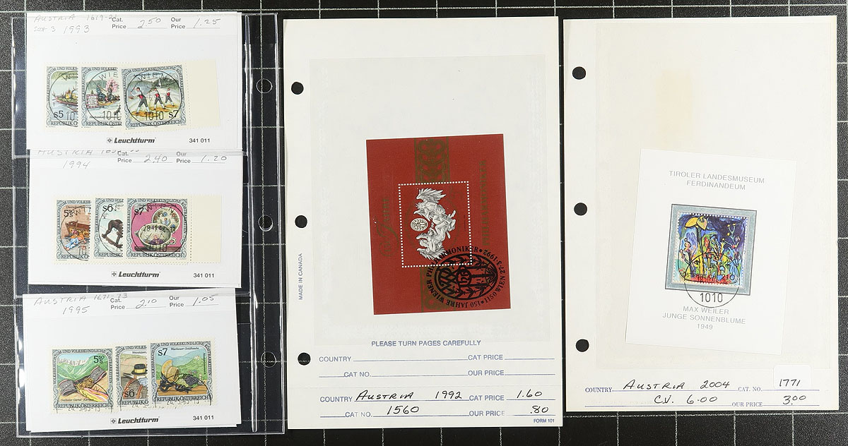 Dealer's stock in identified and valued "102" cards housed in three small 3-ring binders, consisting of Germany #4//2163 (129 stamps, Scott US$968.05), Berlin #9N2//9NB285 (501 stamps, Scott US$1333.75) and Austria #19//2040 plus "back of the book" (124 stamps, Scott US$394.05). A very useful "show-ready" selection of 1872 to 2006 issues with some duplication. The previous owner's retail prices are also indicated though the catalogue values are somewhat out of date. Owner's Scott US$2695.85 ($3639.40 CDN). Estimate =