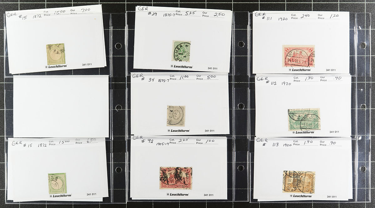 Dealer's stock in identified and valued "102" cards housed in three small 3-ring binders, consisting of Germany #4//2163 (129 stamps, Scott US$968.05), Berlin #9N2//9NB285 (501 stamps, Scott US$1333.75) and Austria #19//2040 plus "back of the book" (124 stamps, Scott US$394.05). A very useful "show-ready" selection of 1872 to 2006 issues with some duplication. The previous owner's retail prices are also indicated though the catalogue values are somewhat out of date. Owner's Scott US$2695.85 ($3639.40 CDN). Estimate =
