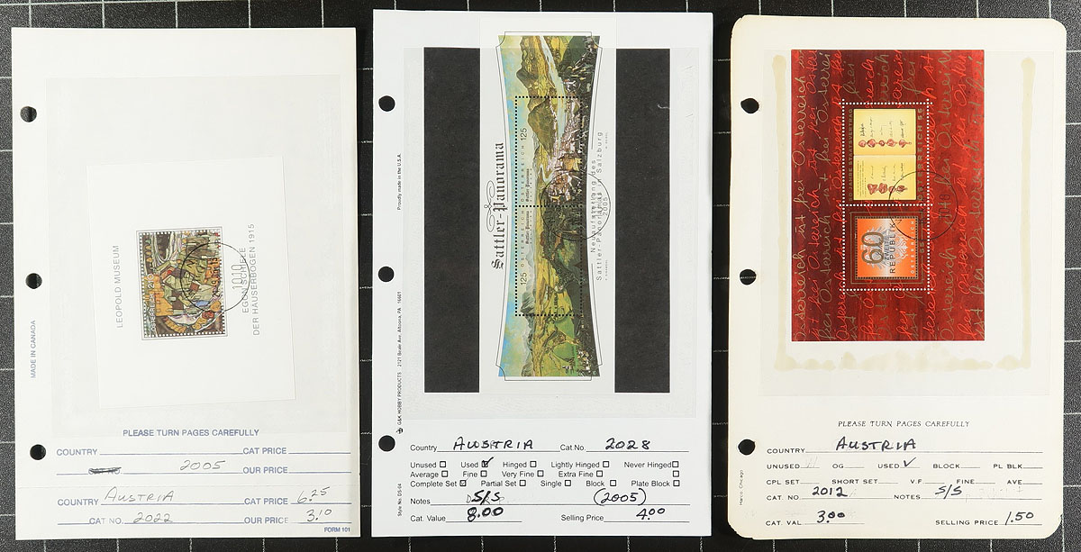 Dealer's stock in identified and valued "102" cards housed in three small 3-ring binders, consisting of Germany #4//2163 (129 stamps, Scott US$968.05), Berlin #9N2//9NB285 (501 stamps, Scott US$1333.75) and Austria #19//2040 plus "back of the book" (124 stamps, Scott US$394.05). A very useful "show-ready" selection of 1872 to 2006 issues with some duplication. The previous owner's retail prices are also indicated though the catalogue values are somewhat out of date. Owner's Scott US$2695.85 ($3639.40 CDN). Estimate =