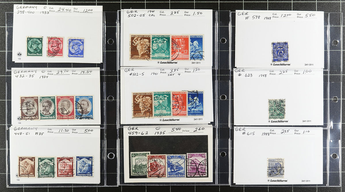 Dealer's stock in identified and valued "102" cards housed in three small 3-ring binders, consisting of Germany #4//2163 (129 stamps, Scott US$968.05), Berlin #9N2//9NB285 (501 stamps, Scott US$1333.75) and Austria #19//2040 plus "back of the book" (124 stamps, Scott US$394.05). A very useful "show-ready" selection of 1872 to 2006 issues with some duplication. The previous owner's retail prices are also indicated though the catalogue values are somewhat out of date. Owner's Scott US$2695.85 ($3639.40 CDN). Estimate =