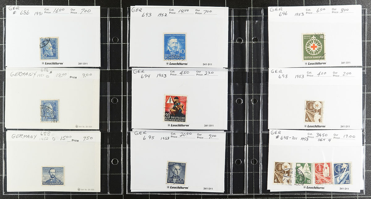 Dealer's stock in identified and valued "102" cards housed in three small 3-ring binders, consisting of Germany #4//2163 (129 stamps, Scott US$968.05), Berlin #9N2//9NB285 (501 stamps, Scott US$1333.75) and Austria #19//2040 plus "back of the book" (124 stamps, Scott US$394.05). A very useful "show-ready" selection of 1872 to 2006 issues with some duplication. The previous owner's retail prices are also indicated though the catalogue values are somewhat out of date. Owner's Scott US$2695.85 ($3639.40 CDN). Estimate =
