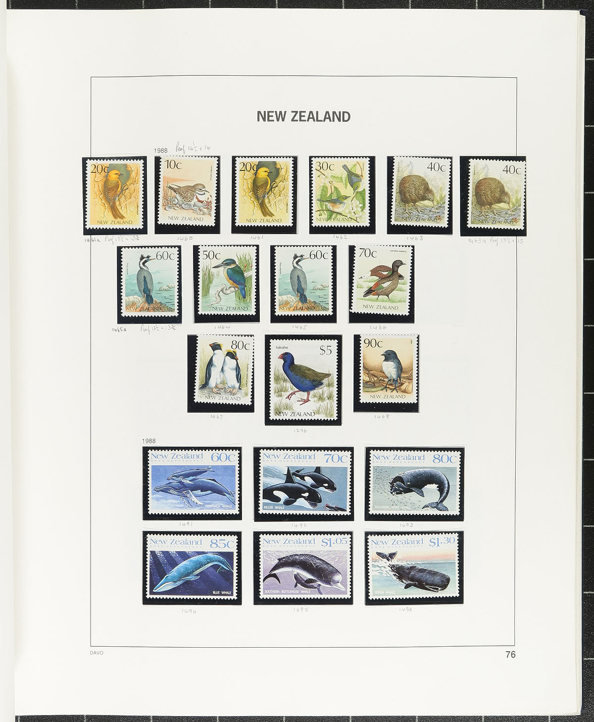 Collection of primarily never hinged New Zealand, 1977-2000, containing many hundreds of stamps in a variety of formats. The lot includes a DAVO album with hingeless pages, containing a few hundred stamps ranging from 1980 to 2000, a few glassines, presentation packs, and album pages. The lot generally ranges from Scott #648/1628, noting a few stamps cataloguing $5 to $10 each, including #650 $5 issue (two strips of 10 each, c.v. $95, face value $100). Owner's older catalogue value for the lot totals US$674.00 (not all material was catalogued), face value alone would be several hundreds of dollars. A nice lot with a variety of purposes, overall very fine. Estimate =