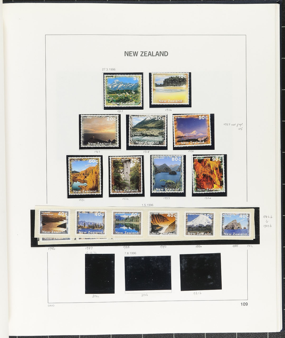 Collection of primarily never hinged New Zealand, 1977-2000, containing many hundreds of stamps in a variety of formats. The lot includes a DAVO album with hingeless pages, containing a few hundred stamps ranging from 1980 to 2000, a few glassines, presentation packs, and album pages. The lot generally ranges from Scott #648/1628, noting a few stamps cataloguing $5 to $10 each, including #650 $5 issue (two strips of 10 each, c.v. $95, face value $100). Owner's older catalogue value for the lot totals US$674.00 (not all material was catalogued), face value alone would be several hundreds of dollars. A nice lot with a variety of purposes, overall very fine. Estimate =