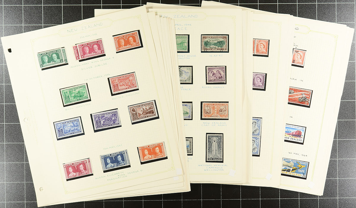 Accumulation of mint and used New Zealand, 1875-1995, containing over 1,000 stamps in roughly 50 album or stock pages, retired sales circuits, and glassines. A spot check indicated a selection of Victorian used material, and continues with singles, sets, and partial sets of used up to the 1930's, with mostly mint material from the 1930's onwards, along with some back of the book material and private posts. Owner's 2019 catalogue value for the lot totals US$1,160.00, leaving better finds to the dedicated collector, face value alone could be a few hundred dollars. A few faults to be expected, overall fine to very fine. Estimate =