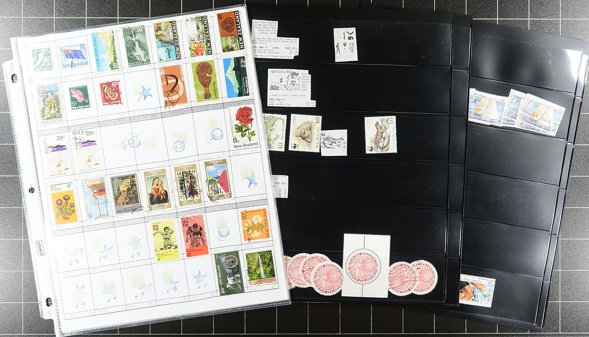 Accumulation of mint and used New Zealand, 1875-1995, containing over 1,000 stamps in roughly 50 album or stock pages, retired sales circuits, and glassines. A spot check indicated a selection of Victorian used material, and continues with singles, sets, and partial sets of used up to the 1930's, with mostly mint material from the 1930's onwards, along with some back of the book material and private posts. Owner's 2019 catalogue value for the lot totals US$1,160.00, leaving better finds to the dedicated collector, face value alone could be a few hundred dollars. A few faults to be expected, overall fine to very fine. Estimate =