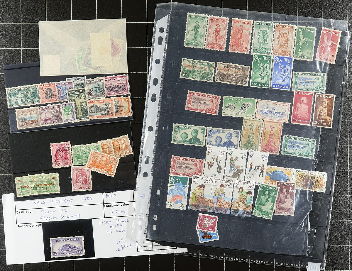 Accumulation of mint and used New Zealand, 1875-1995, containing over 1,000 stamps in roughly 50 album or stock pages, retired sales circuits, and glassines. A spot check indicated a selection of Victorian used material, and continues with singles, sets, and partial sets of used up to the 1930's, with mostly mint material from the 1930's onwards, along with some back of the book material and private posts. Owner's 2019 catalogue value for the lot totals US$1,160.00, leaving better finds to the dedicated collector, face value alone could be a few hundred dollars. A few faults to be expected, overall fine to very fine. Estimate =