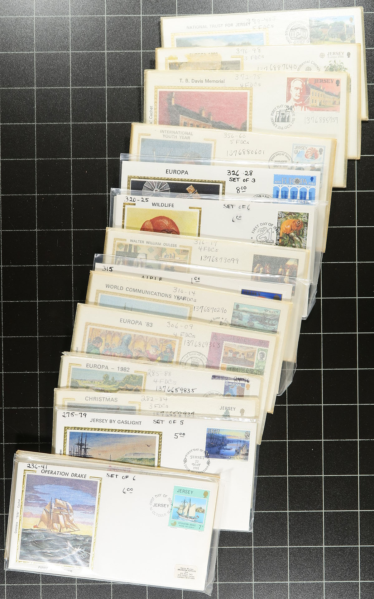 Lovely collection of Channel Islands "Colorado Silk" first day covers, 1979-1986, containing roughly 475 covers neatly organized by sets in individual plastic cover holders. We note representation from Isle of Man (x200), Jersey (x220), Guernsey (x38), along with a handful of covers from Ireland, with primarily single stamp frankings. A lovely clean lot, retailing over $700, ideal for collectors and dealers alike. Estimate =