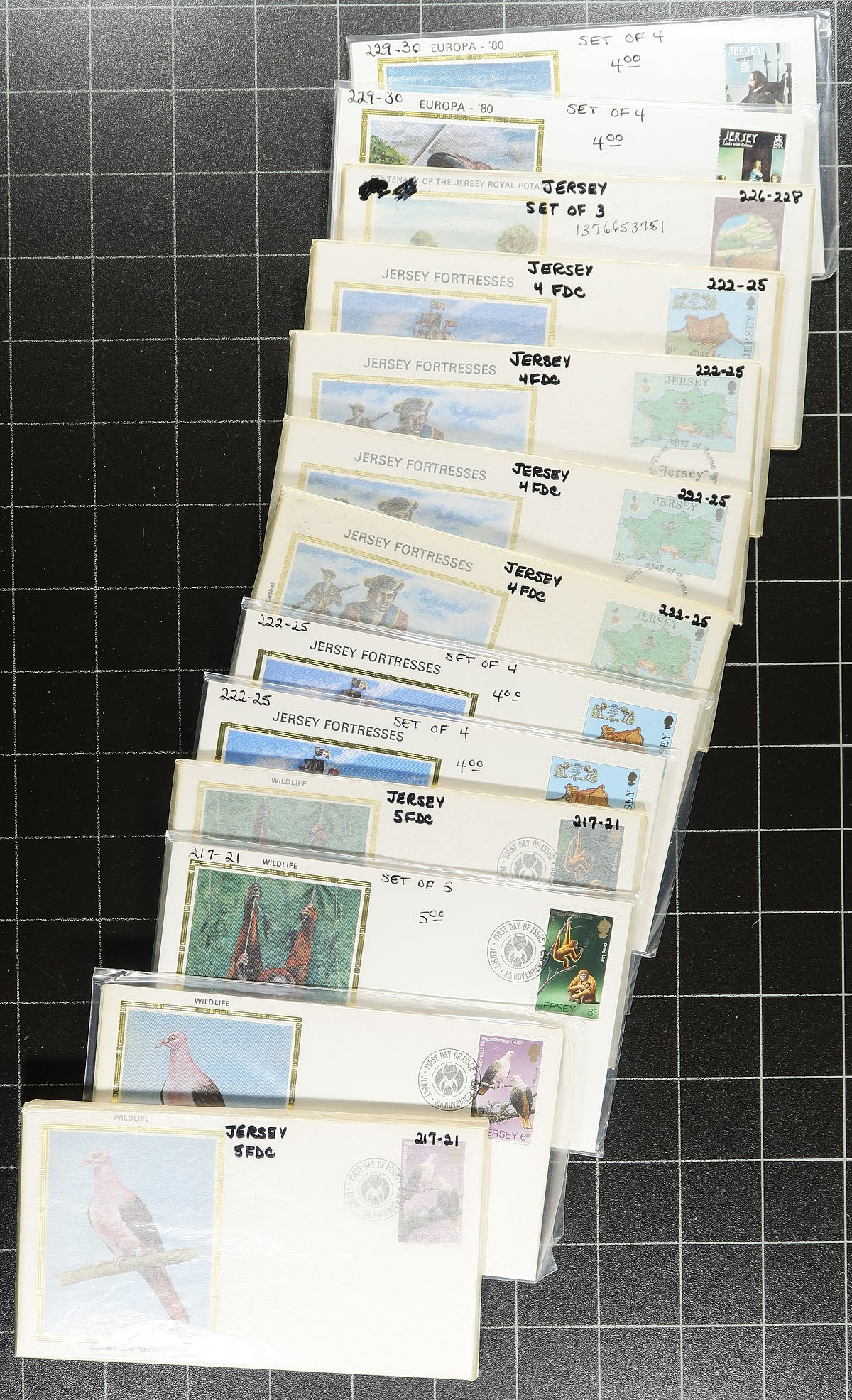 Lovely collection of Channel Islands "Colorado Silk" first day covers, 1979-1986, containing roughly 475 covers neatly organized by sets in individual plastic cover holders. We note representation from Isle of Man (x200), Jersey (x220), Guernsey (x38), along with a handful of covers from Ireland, with primarily single stamp frankings. A lovely clean lot, retailing over $700, ideal for collectors and dealers alike. Estimate =