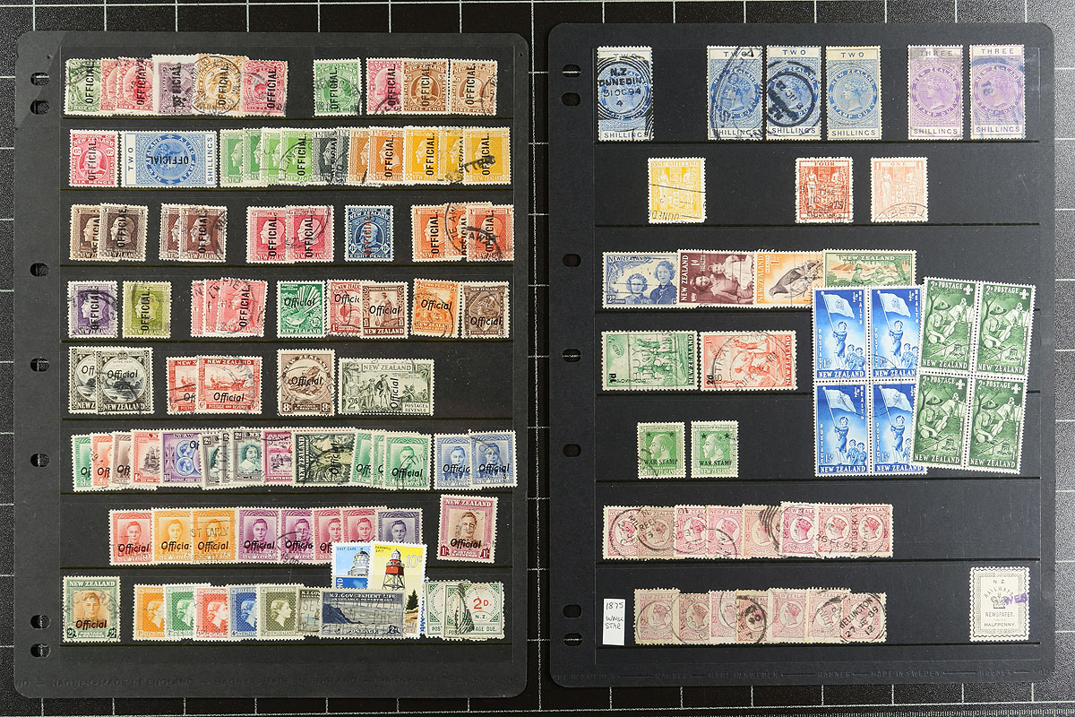 Interesting group of mint and used New Zealand back of the book issues, 1879's-1960's, containing many hundreds of stamps in roughly 25 album or stock pages, and a few glassines. The lot contains a wide variety of items, mostly used, including Postal-Fiscals, Officials, Newspaper stamps, Airmails, Health sheets, and more. A cursory check of issues indicated some single and sheets cataloguing $10 to $20 each, including #s C5 (mh, $50), O111 (used, $57), leaving other finds to the dedicated collector. A nice lot for all collectors, overall fine to very fine. Estimate =