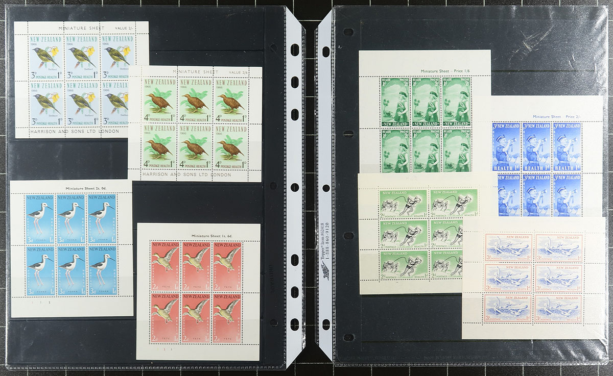 Interesting group of mint and used New Zealand back of the book issues, 1879's-1960's, containing many hundreds of stamps in roughly 25 album or stock pages, and a few glassines. The lot contains a wide variety of items, mostly used, including Postal-Fiscals, Officials, Newspaper stamps, Airmails, Health sheets, and more. A cursory check of issues indicated some single and sheets cataloguing $10 to $20 each, including #s C5 (mh, $50), O111 (used, $57), leaving other finds to the dedicated collector. A nice lot for all collectors, overall fine to very fine. Estimate =