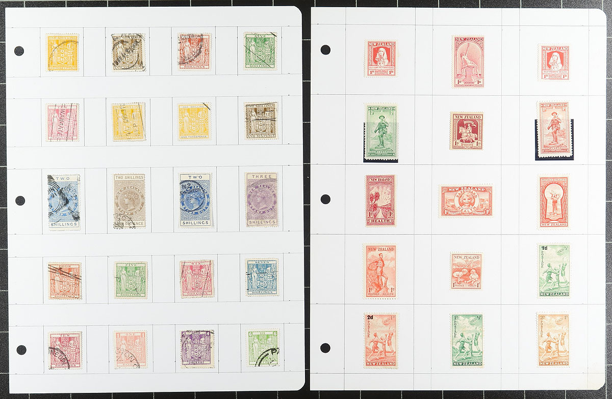 Interesting group of mint and used New Zealand back of the book issues, 1879's-1960's, containing many hundreds of stamps in roughly 25 album or stock pages, and a few glassines. The lot contains a wide variety of items, mostly used, including Postal-Fiscals, Officials, Newspaper stamps, Airmails, Health sheets, and more. A cursory check of issues indicated some single and sheets cataloguing $10 to $20 each, including #s C5 (mh, $50), O111 (used, $57), leaving other finds to the dedicated collector. A nice lot for all collectors, overall fine to very fine. Estimate =