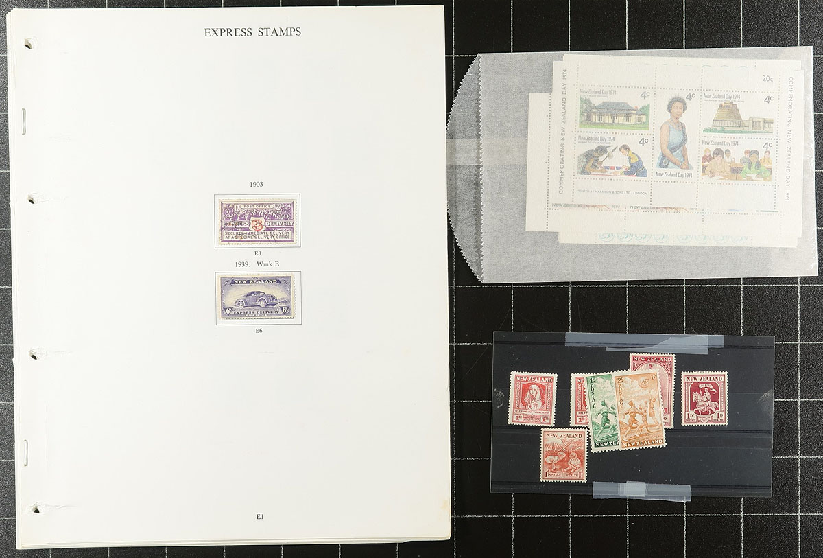 Interesting group of mint and used New Zealand back of the book issues, 1879's-1960's, containing many hundreds of stamps in roughly 25 album or stock pages, and a few glassines. The lot contains a wide variety of items, mostly used, including Postal-Fiscals, Officials, Newspaper stamps, Airmails, Health sheets, and more. A cursory check of issues indicated some single and sheets cataloguing $10 to $20 each, including #s C5 (mh, $50), O111 (used, $57), leaving other finds to the dedicated collector. A nice lot for all collectors, overall fine to very fine. Estimate =