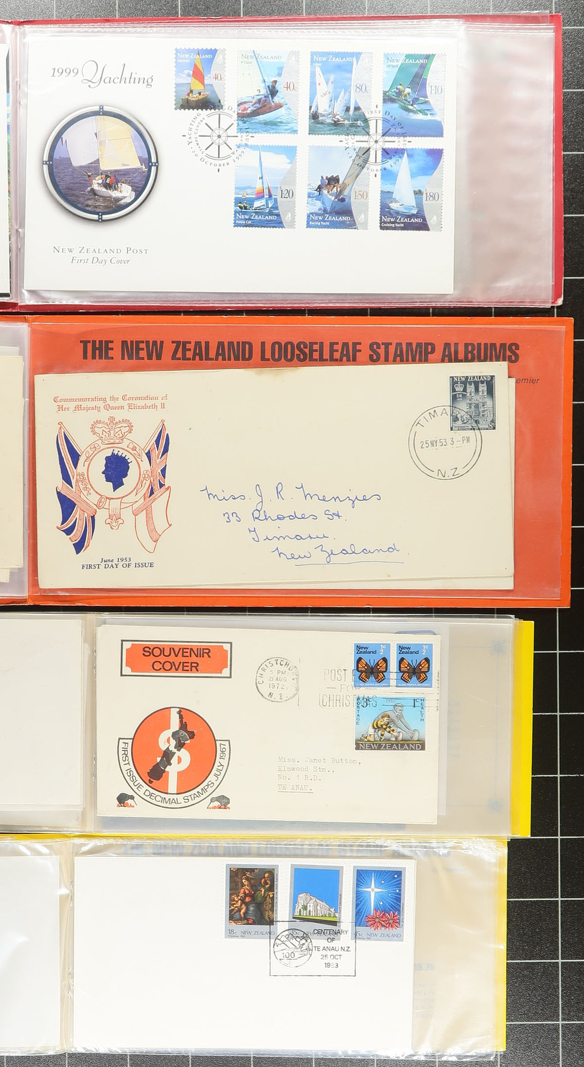 Collection / accumulation of New Zealand first day covers, 1930's-1980's, containing roughly 300 covers mostly loose in a box and a few small cover albums and first day cover packs. The lot contains primarily sets frankings, along with singles and a few souvenir sheets, with many having colourful cachets. A lovely lot for the topical and thematic collector as we encountered several suitable subjects. A few covers have small corner bends, otherwise a very colourful group for all collectors, overall fine to very fine. Estimate =