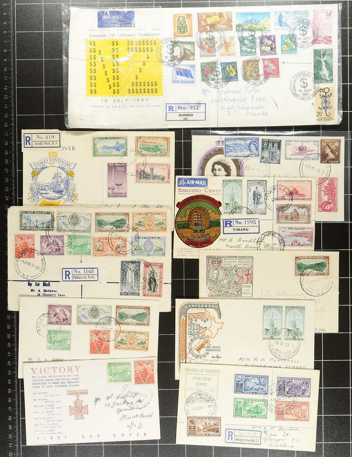 Collection / accumulation of New Zealand first day covers, 1930's-1980's, containing roughly 300 covers mostly loose in a box and a few small cover albums and first day cover packs. The lot contains primarily sets frankings, along with singles and a few souvenir sheets, with many having colourful cachets. A lovely lot for the topical and thematic collector as we encountered several suitable subjects. A few covers have small corner bends, otherwise a very colourful group for all collectors, overall fine to very fine. Estimate =