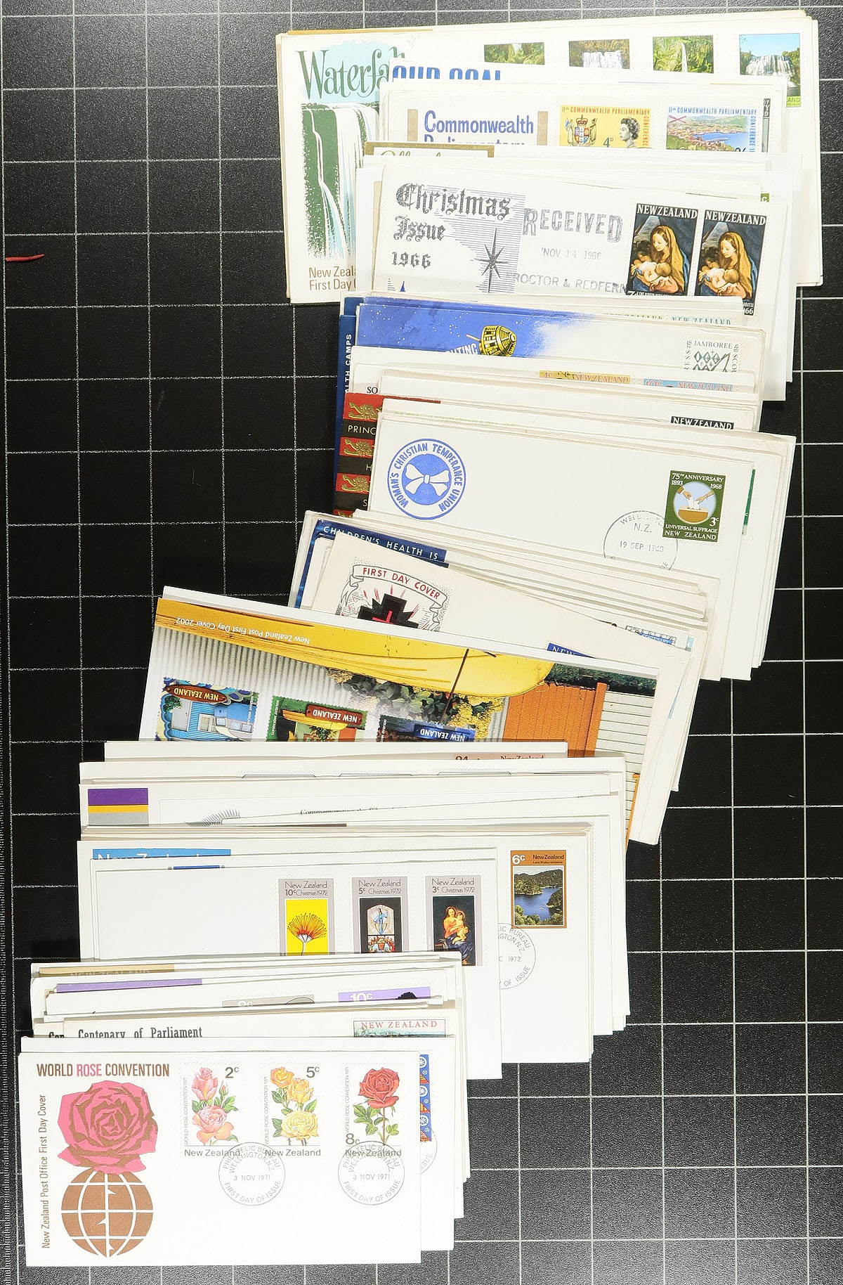 Collection / accumulation of New Zealand first day covers, 1930's-1980's, containing roughly 300 covers mostly loose in a box and a few small cover albums and first day cover packs. The lot contains primarily sets frankings, along with singles and a few souvenir sheets, with many having colourful cachets. A lovely lot for the topical and thematic collector as we encountered several suitable subjects. A few covers have small corner bends, otherwise a very colourful group for all collectors, overall fine to very fine. Estimate =