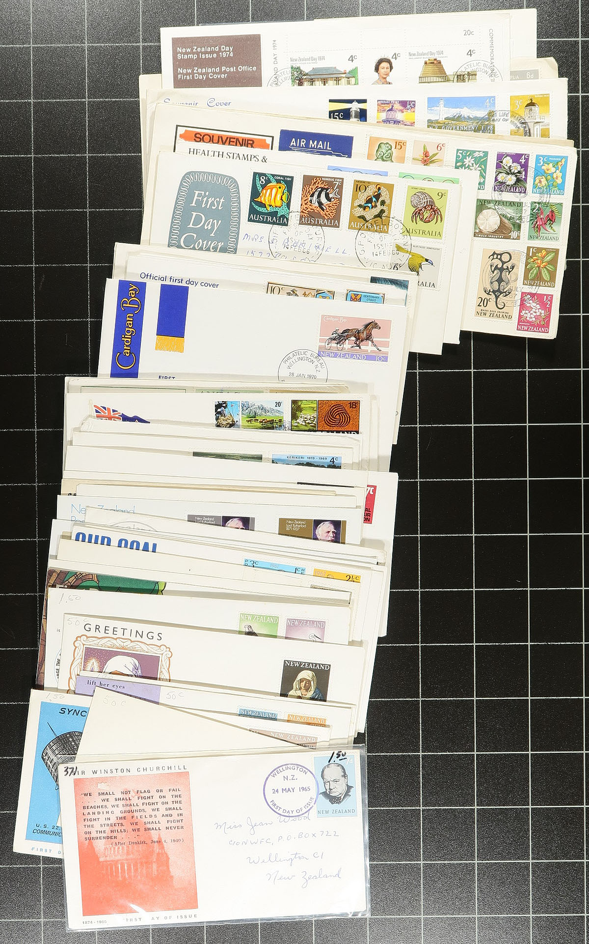 Collection / accumulation of New Zealand first day covers, 1930's-1980's, containing roughly 300 covers mostly loose in a box and a few small cover albums and first day cover packs. The lot contains primarily sets frankings, along with singles and a few souvenir sheets, with many having colourful cachets. A lovely lot for the topical and thematic collector as we encountered several suitable subjects. A few covers have small corner bends, otherwise a very colourful group for all collectors, overall fine to very fine. Estimate =