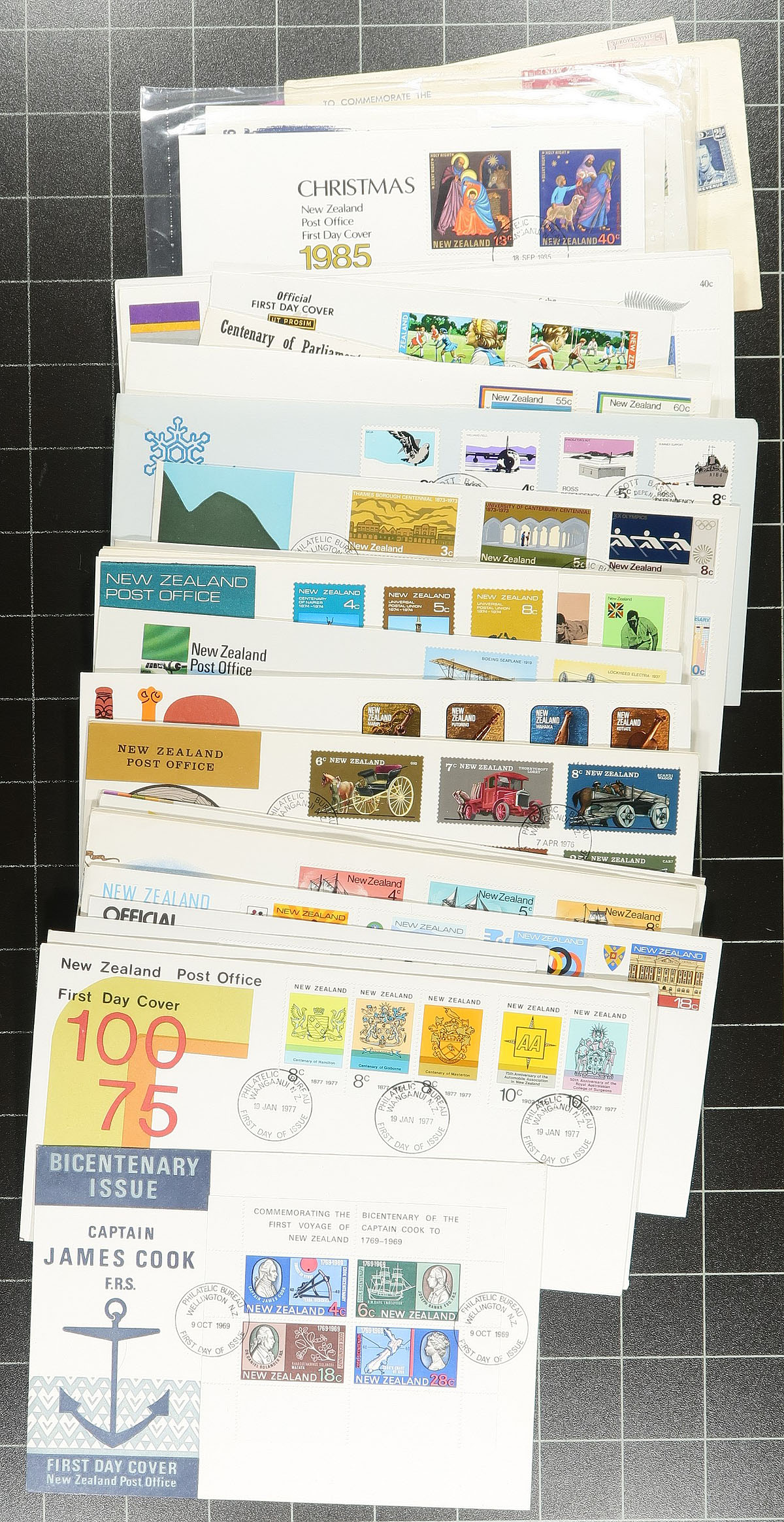 Collection / accumulation of New Zealand first day covers, 1930's-1980's, containing roughly 300 covers mostly loose in a box and a few small cover albums and first day cover packs. The lot contains primarily sets frankings, along with singles and a few souvenir sheets, with many having colourful cachets. A lovely lot for the topical and thematic collector as we encountered several suitable subjects. A few covers have small corner bends, otherwise a very colourful group for all collectors, overall fine to very fine. Estimate =