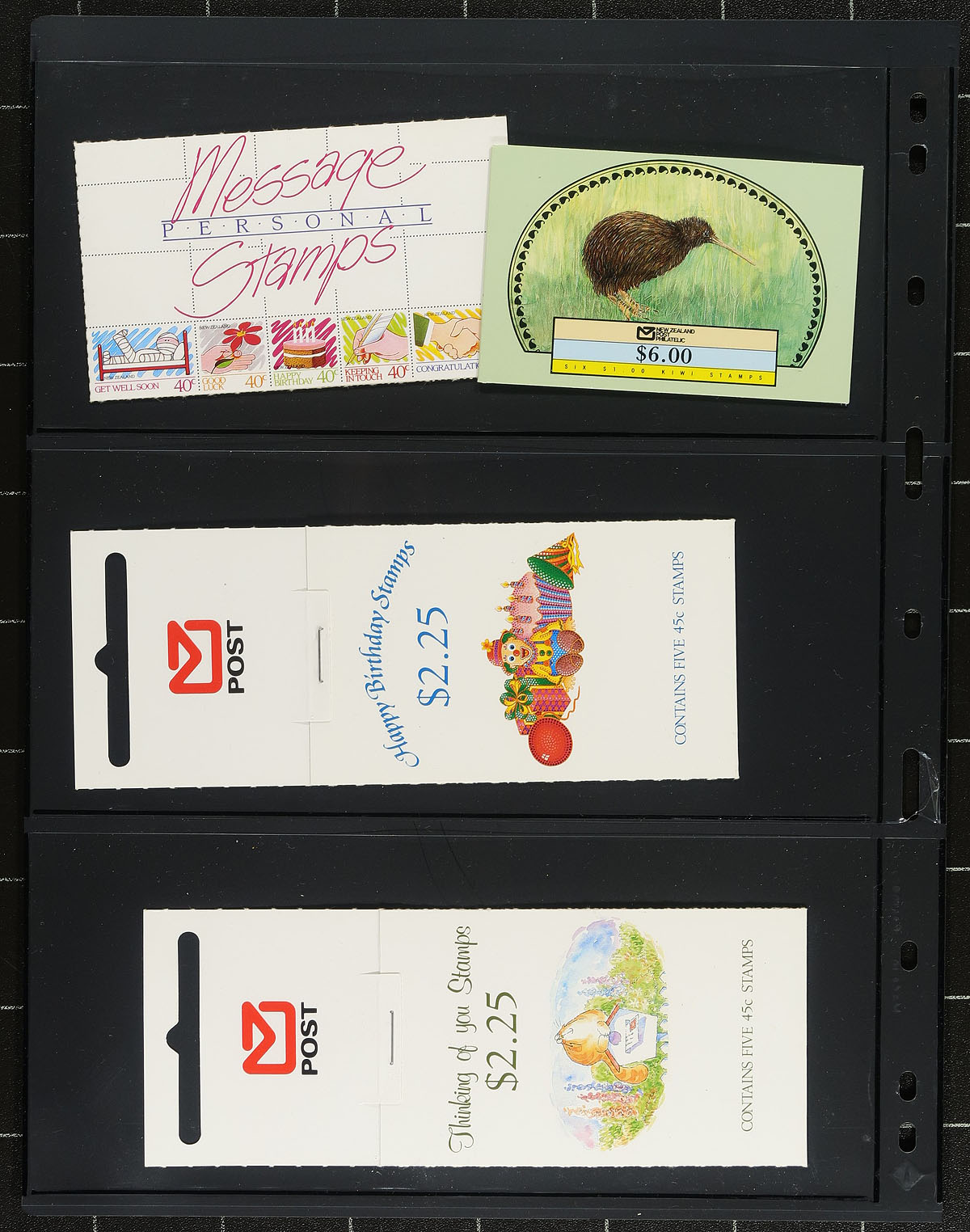 Group of roughly 100 New Zealand booklets, 1950's-1980's, including a few booklets from the 1954-1959 issues noting various booklet advertising with a few cataloguing $25 and up, along with primarily modern booklets mostly from the 1980's-1990's. Face value alone for the lot totals NZ$489.00, mostly 50c to $1 denominations. A nice clean lot for New Zealand or booklet collectors, noting a bit of mild duplication, very fine. Estimate =