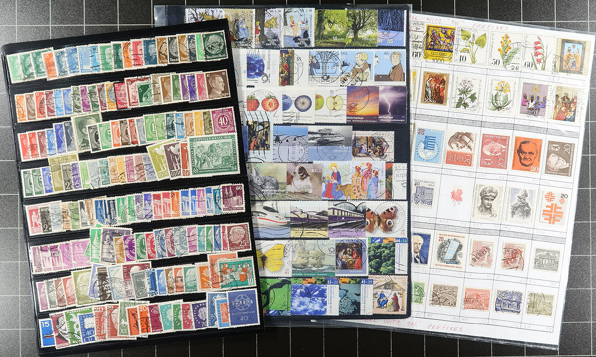 Collection of used Germany, 1880's-2016, containing a few thousand stamps on roughly 30 album or stock pages. The collection contains representation from Germany, DDR, and Berlin issues, along with selections of semi-postals, early issues, and a few modern semi-postals. A spot check indicated singles, sets, and partial sets cataloguing $10 and up each, including #s Germany 665-669 (c.v. $155 total), leaving better finds to the dedicated collector. Owner's 2019 Scott catalogue value for the lot totals US$2,234.00 ($3015.20 CDN). Duplication up to 2 for some issues, a few faults to be expected, overall fine to very fine. Estimate =