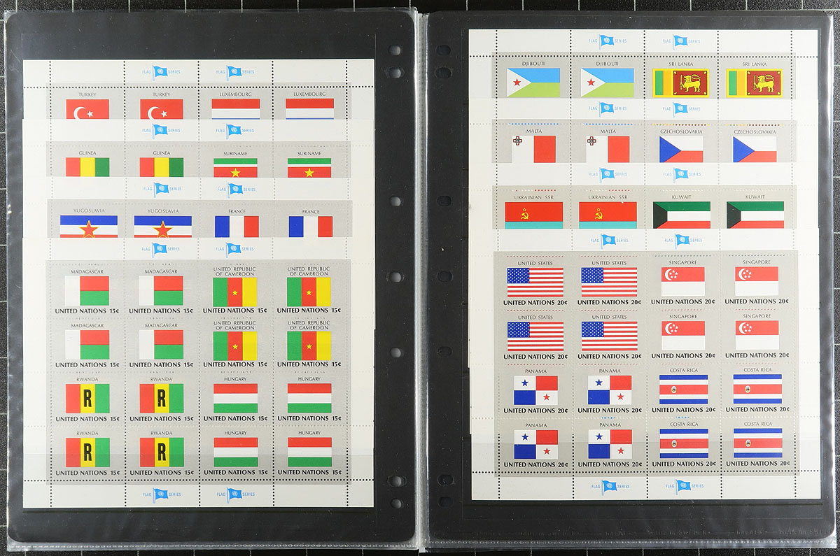 Lovely collection of primarily never hinged United Nations, 1960's-2011, containing over 1,000 stamps in roughly 20 album or stock pages, a stockbook, and in glassines. A cursory check indicated representation from Offices in New York, Geneva, and Vienna, noting several sets, a few booklets, presentation packs, several souvenir sheets including complete Flag series, endangered species sheetlets (1994-1995, 2000-2001), and much more. A great lot for topical or thematic collectors encountering several suitable topics. Clean and very fine. Estimate =
