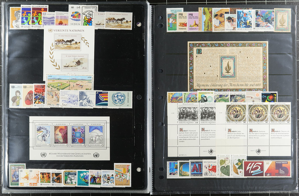 Lovely collection of primarily never hinged United Nations, 1960's-2011, containing over 1,000 stamps in roughly 20 album or stock pages, a stockbook, and in glassines. A cursory check indicated representation from Offices in New York, Geneva, and Vienna, noting several sets, a few booklets, presentation packs, several souvenir sheets including complete Flag series, endangered species sheetlets (1994-1995, 2000-2001), and much more. A great lot for topical or thematic collectors encountering several suitable topics. Clean and very fine. Estimate =
