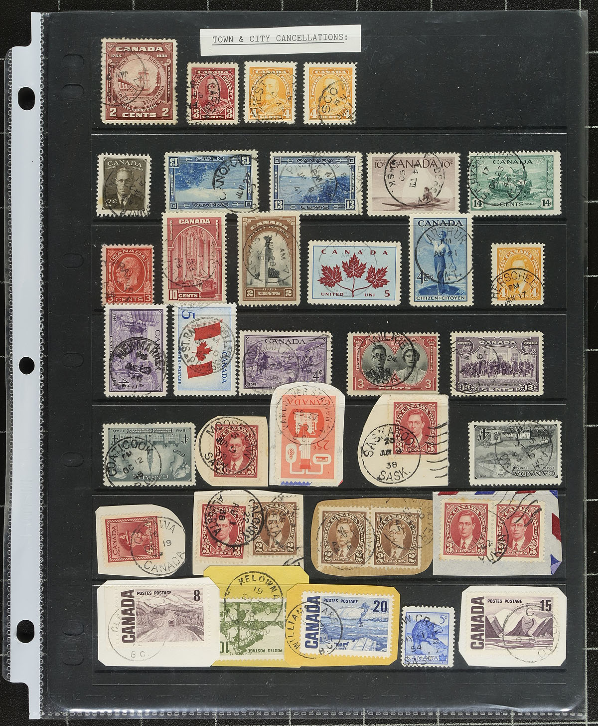 Consignment remainders of used Canada collected for postmarks, 1900's-2010's, containing roughly 1,300 stamps, mostly on piece, generally well organized in stock pages and plastic baggies. We note better representation from British Columbia (over 500), Ontario (roughly 500), along with smaller representation from mostly western towns, with many hundreds of different towns represented in the lot. Postmark interest includes POCON, cds, split ring, Klussendorf, and perhaps a few other types. Not checked for better towns, and ideal for the postmark hunter. Estimate =