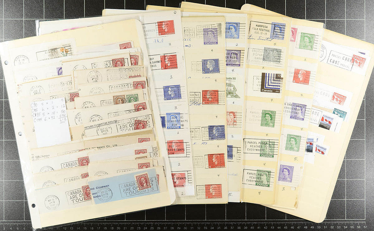 Consignment remainders of used Canada collected for postmarks, 1900's-2010's, containing roughly 1,300 stamps, mostly on piece, generally well organized in stock pages and plastic baggies. We note better representation from British Columbia (over 500), Ontario (roughly 500), along with smaller representation from mostly western towns, with many hundreds of different towns represented in the lot. Postmark interest includes POCON, cds, split ring, Klussendorf, and perhaps a few other types. Not checked for better towns, and ideal for the postmark hunter. Estimate =