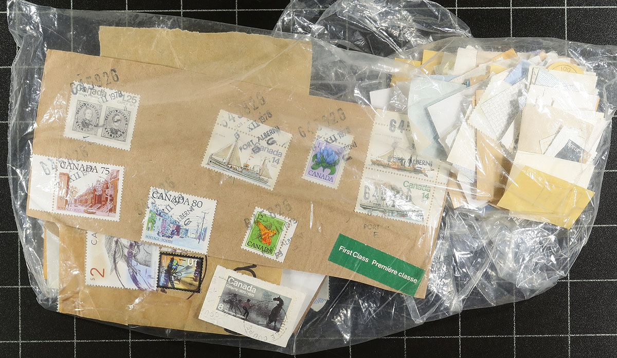 Consignment remainders of used Canada collected for postmarks, 1900's-2010's, containing roughly 1,300 stamps, mostly on piece, generally well organized in stock pages and plastic baggies. We note better representation from British Columbia (over 500), Ontario (roughly 500), along with smaller representation from mostly western towns, with many hundreds of different towns represented in the lot. Postmark interest includes POCON, cds, split ring, Klussendorf, and perhaps a few other types. Not checked for better towns, and ideal for the postmark hunter. Estimate =