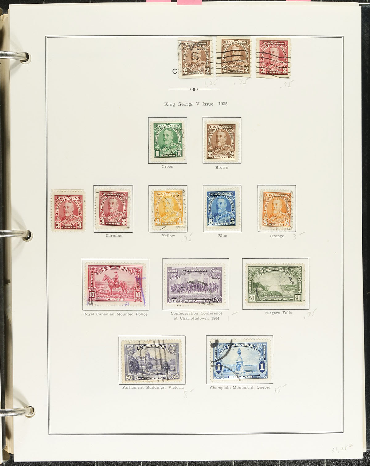 Starter collection of primarily used Canada, 1870's-1978, containing many hundreds of stamps in Minkus and Jarrett album pages in an album. The collection begins with a small selection of used low denomination Victorian issues, and partial sets of Edwards, Quebecs, Admirals, onward, with full sets of Pictorial, War, and Peace issues. The collection continues with a mixture of mint and used stamps, including back of the book issues, with pages up to 1978 (includes pages for BNA stamps), noting a few stamps cataloguing in the $5 to $10 range. A nice start to begin a Canada collection. Estimate =