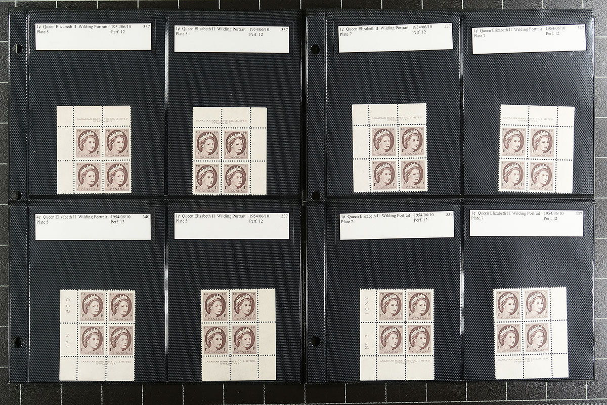 Collection of primarily never hinged QEII Wilding plate blocks, containing 99 plate blocks, almost all in matched sets, neatly organized by denomination in hingeless album pages or stock pages. The collection begins with 1c matched set of plate blocks ranging from plates #s 1-7, 8n, 9, 11-12, and continues with "G" overprint official matched set plate blocks for all Wilding denominations with various plate numbers. Owner's 2007 Unitrade value for the collection totals $413.00 (counted as fine with no NH premiums). A nice clean group and something to add to your Canada collection. Estimate =