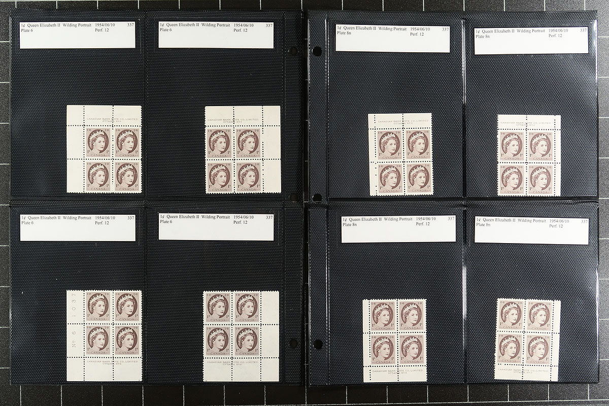 Collection of primarily never hinged QEII Wilding plate blocks, containing 99 plate blocks, almost all in matched sets, neatly organized by denomination in hingeless album pages or stock pages. The collection begins with 1c matched set of plate blocks ranging from plates #s 1-7, 8n, 9, 11-12, and continues with "G" overprint official matched set plate blocks for all Wilding denominations with various plate numbers. Owner's 2007 Unitrade value for the collection totals $413.00 (counted as fine with no NH premiums). A nice clean group and something to add to your Canada collection. Estimate =